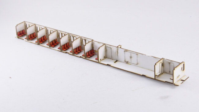 Hotový interiér BDmeer – u první testovací verze jsem oddíl nejvíc vpravo zaslepil a je z něj „jako WC“. Za matným oknem to nebude vidět. Špatně umístěné WC jsem odstranil. Ve finálních stavebnicích je samozřejmě opraveno.