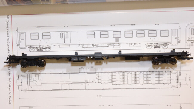 Opět doporučím knihu Osobní vozy II, podle které se dá spodní výbava osadit ajn-cvaj. Dokonce je to téměř v měřítku 1:120, takže to jde krásně použít jako šablona. Tady je vidět, že u BDmeer není výměník uprostřed vozu ale je přemístěný více pod oddílovou část. Do této předělávky už po minulé zkušenosti s Bdmtee nejdu, protože rám se rozpadne na dva díly.