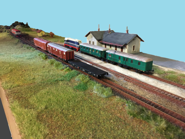 Po cca 3 měsících od objednání frézování překližky jsou moduly se základní krajinou a budovami kompletně provozuschopné včetně výhybek řízených digitálně (po naprogramování lze servo dekodér připojit rovnou na dvojlinku napájení kolejí – programování musí proběhnout přes „programovací kolej“).