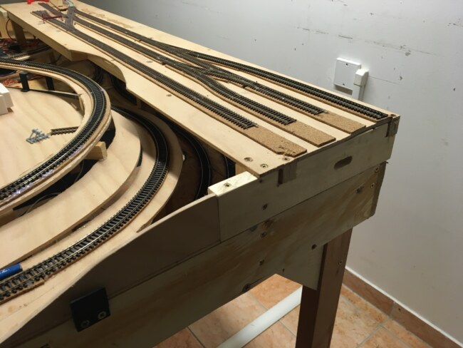 Ta musí být rovná a kolmá ke koleji, jenž bude pokračovat na modul. Tyto podmínky si vyžádaly úpravu rámu, doplnění prkna s výřezy pro elektrické propojení a se šrouby. Vše musí hezky lícovat. Příprava napojení na modul – 2. kolej od zadní hrany kolejiště bude průběžná.