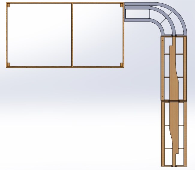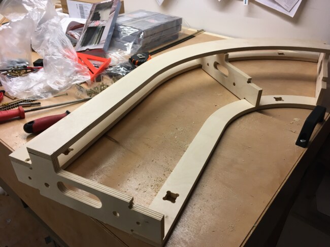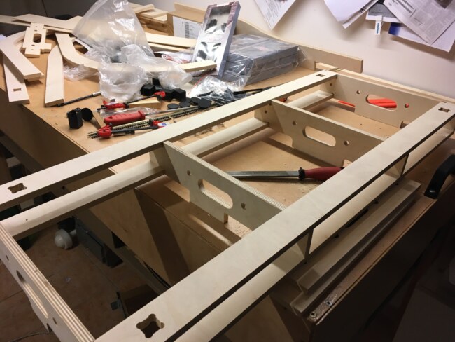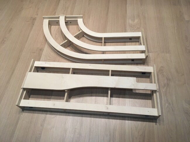Tím byl návrh hotov a přistoupilo se k realizaci – po vzoru modulů brno, jsem si veškeré potřebné díly nechal vyfrézovat do překližky (12mm na čela, žebra a podélníky, 4mm na bočnice). Domů vám pak dorazí hezká stavebnice, kterou zvládnete sestavit za jeden, maximálně dva večery.