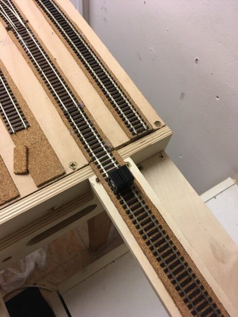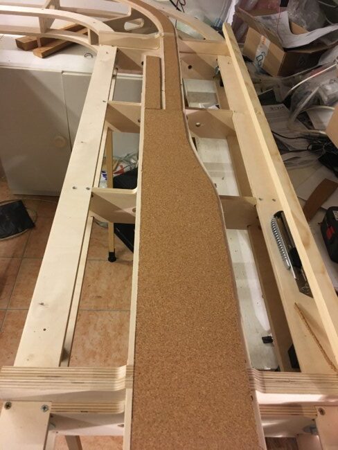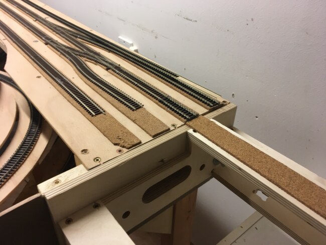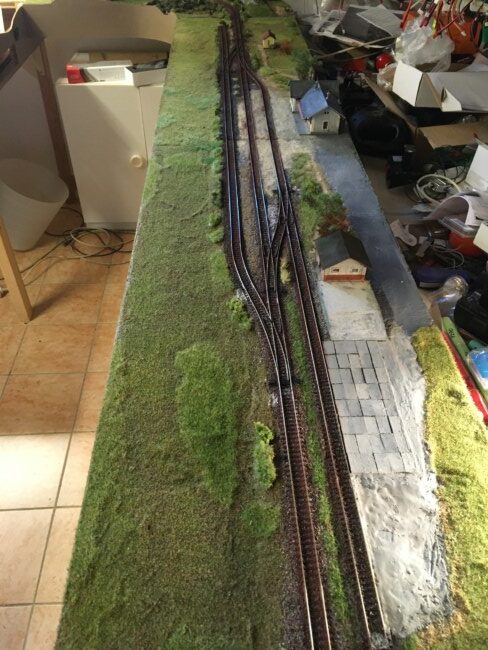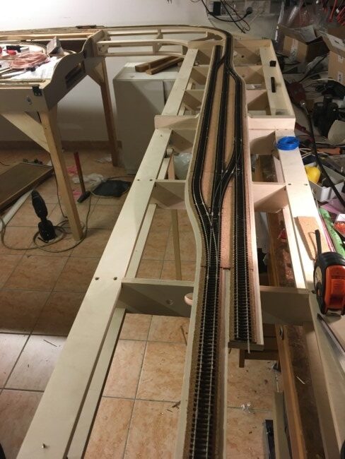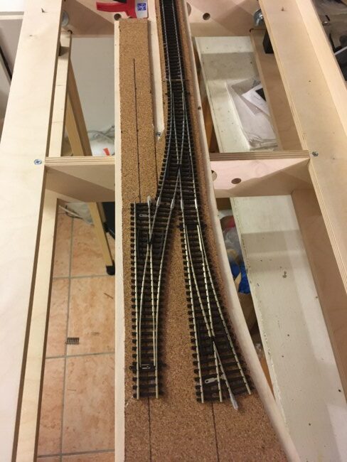Jakmile byly rámy zkompletovány, sešrobouvány k sobě a „na nohou“ následovala klasická pokádka kolejí. Základem opět korek o tloušťce 3mm přilepený tavnou pistolí. Na něj položené koleje z flexi od Tilliga. Výhybky jsem použil Tillig EW2. Napájení srdcovek je vedeno z Wago svorky průběžného napájení do spínače na přestavnících. Tím je zajištěna vysoká spolehlivost, Všechny konce drátů jsou krimpovány a všechny kolejnicové spoje proletovány.