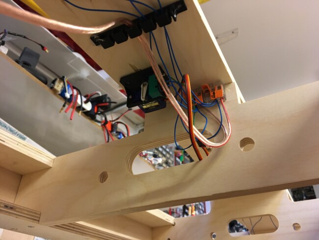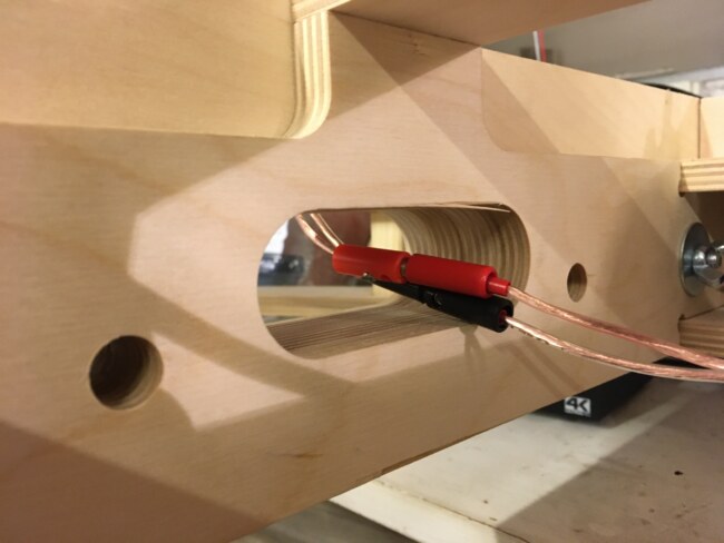 Rámy spočívají na nožičkách z hranolu 20x20mm. Na koncích stojí na nožkách ze šroubů M8 a s botkou, které jsem si tisknul. Moduly jsou k sobě sešroubovány rovněž osmičkami s křídlovými maticemi. Elektricky je vše propojeno dvojlinkou s „banánky“. Každý modul má minimálně jedno napájecí místo pro každou kolej. Veškerá kabeláž je držena na rámu v okách z 3D tisku. Elektrické propojení zajišťuje dvojlinka spojovaná „banánky“.