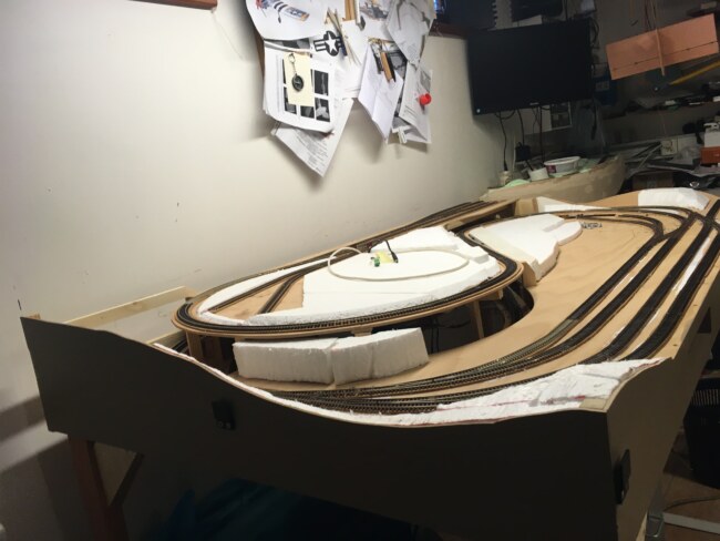 Dále bylo potřeba na napojení připravit kolejiště. V mezičase jsem totiž začal budovat základy pro krajinu – výplně z polystyrenu a zvýšené boky s reliéfem krajiny z překližky. To šlo ruku v ruce s přípravou styčné plochy s prvním modulem.
