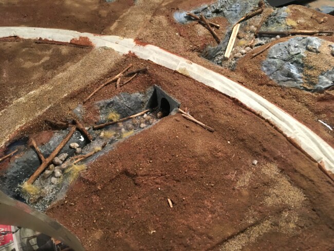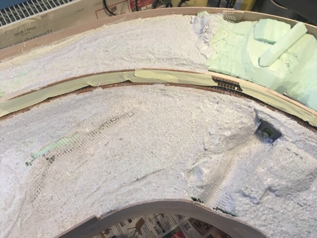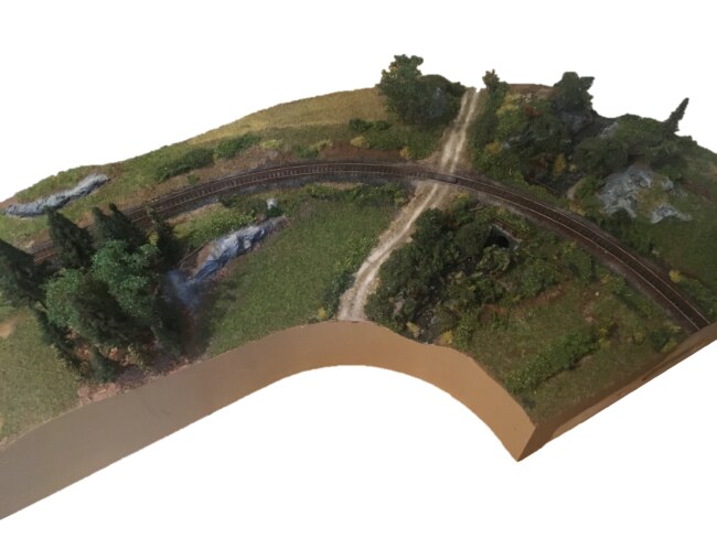 Jako základ posloužil tvrdý polystyren, co se používá pro izolaci podlah. U staničního modulu to bylo velmi jednoduché – nařezal jsem jej na pruhy a vyplnil jimi prostor mezi tratí a bočicí. Vše jsem lepil Herkulesem. Drobné dirky pak vyplnim horkým lepidlem a kusy polystyrenu. U obloukového modulu jsem se rozhodl přidat ještě propustek s poměrně hlubokým korytem potoka. Vedle něj pak polní cestu s nechráněným přejezdem. Na polystyren nanáším nahrubo špachtlí směs z obyčejné sádry, jemného písku a lepidla Duvillax (něco jako průmyslový Herkules). Občas si vypomůžu samolepící perlinkou na sádrokarton.