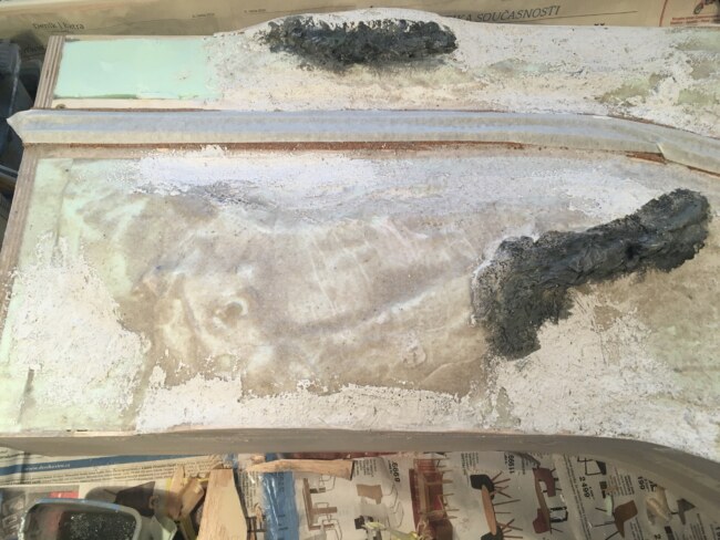 Než tato vrstva komplentě ztuhla, začal jsem tvořit drobné skalky v místech prudších svahů a okolo potoka. Skalky jsem vytvořil s papírových neperforovaných utěrek, které jsem štětcem napustil zředěným Duvillaxem s trochou sádry. Duvilax zajistí přilavost utěrky k podkladu, trocha sádry pak jako výztuha. Celou skalku jsem fromoval štětcem, k prstům by se přilepila.
