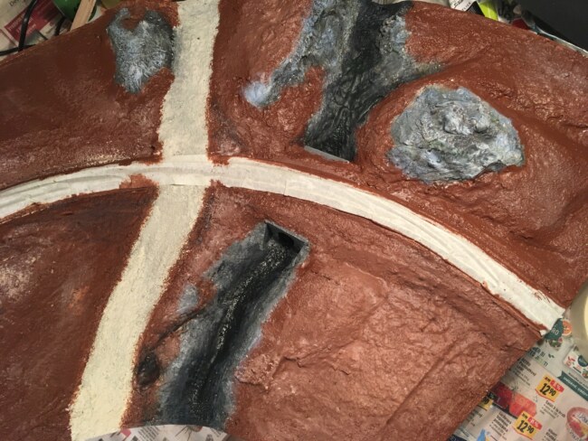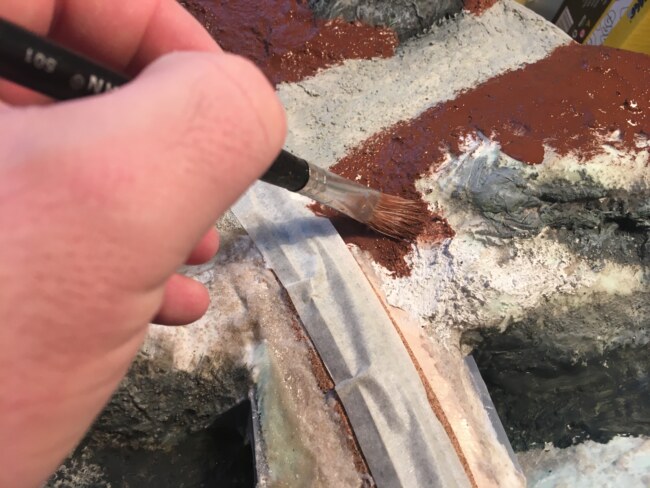 Po důkladném proschnutí (téměř 2 dny) mohou přijít na řadu barvy. Používám umělecké akrylové – výborně se s nimi pracuje, dobře kryjí a dají se míchat do všech odstínů – v podstatě jimi skálynamaluji, jen ve 3D. Zbytek natírám hnědým Balakrylem. Prašnou cestu světle okrovými odstíny.
