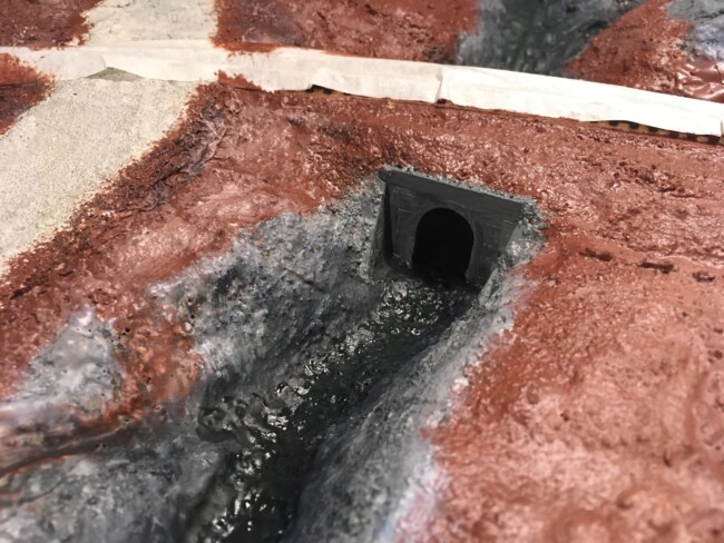 Také jsem se snažil zavodnit potok modelovou vodou od Nocha (č. 60876). Sic je její použití velice jednoduché (nalij a počkej než ztuhne), tak moc radosti neudělala – velmi vzlíná, díky povrchovému napětí dělá zvedlé okraje a při schnutí velmi zmenšuje svůj objem.
