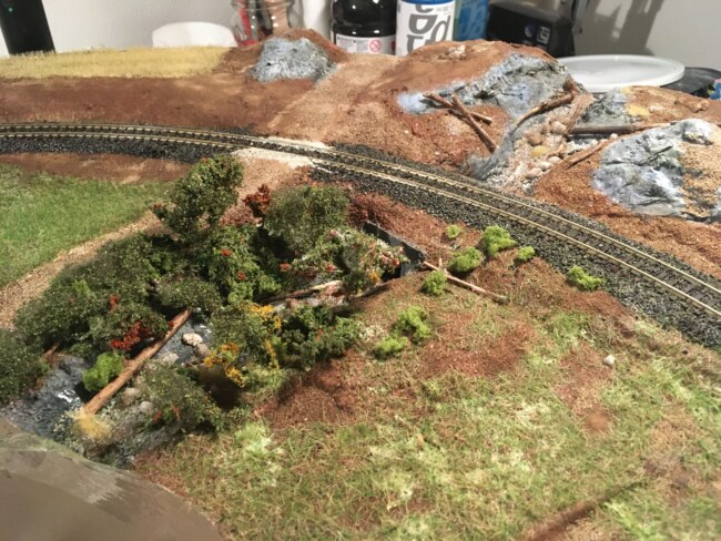 Jakmile je vše natřeno v základu, lze po proschnutí přistoupit k posypům, statické trávě a stromům. Do potoka jsem vlepil kousky skutečných větviček jako staré kmeny. Z „hračkoidních“ keřů od Falleru jsem vytvořil náletové dřeviny. Jako poslední přišlo na řadu osazení stromečků. Zbylé detaily jako kaplička u cesty, kříže u přejezdu či pískáček byli již třešničkou na dortu.