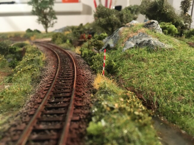 Podél celé trati by do budoucna měly jít telegrafní sloupy. Dle mého názoru je nejdůležitějěší po detailech patina. Nebát se zašpinit fasádu, natřít koleje rzí, udělat prachové stopy an cestách a pěšinách, přidat šmír okolo přestavníků výhybek…