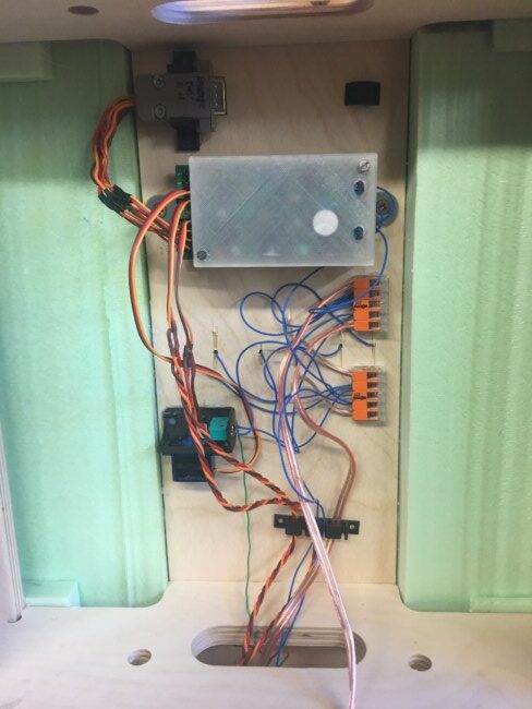 U přechodů se koleje přeřízly co nejtenčím řezem (méně než 1mm), případně jsem řezal již v průběhu lepení, abych docílil naprosot minimální spáry. Jen pozor, aby výsledně odrříznutá kolej nepřesahovala okraj modulu – dříve ři později by mohlo dojít k jejímu vytržení při manipulaci se samotným modulem. O řízení všech šesti serv se opět stará dekodér verze 4 od Jiřího Krále. Je umístěn na jednom ze staničních modulů. Propojovací kabely jsou osazeny konektorem pro snadné rozpojení modulů. Dekodér je přišroubován na destičce z 3D tisku, za kterou drží na modulu. Ze shora je opatřen krytem (také 3D tisk). Pohled na elektroinstalaci – konektor k servům, dekodér, svorky, přestavník.