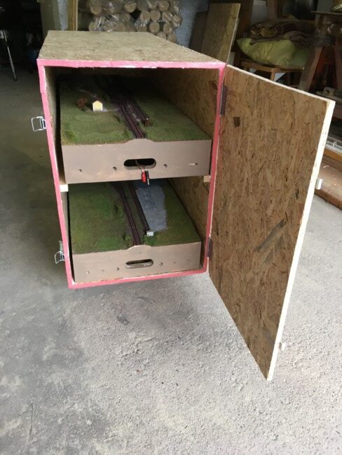 Hned po zahájení provozu se ukázalo, jak 3m kolejí pomohly. Dá se ve dvou krásně zajezdit, kdy každý může pohodlně ovládat 2 soupravy díky ABC úsekům ve skryťáku. Možná si teď někteří kladou otázku, kam s nimi? Moduly se po rozložení musí někam uskladnit. Přechodový modul se naštěstí vešel do skříně a na zbylé dva moduly jsem vyrobil přepravní box z OSB desek. Ten je zároveň na kolečkách, takže manipulace je snadná a ihned našel místo pod kolejištěm. Ano, je to vcelku proces, než si člověk trochu zajezdí, ale stojí to za to 🙂