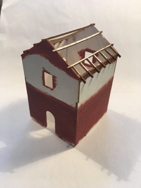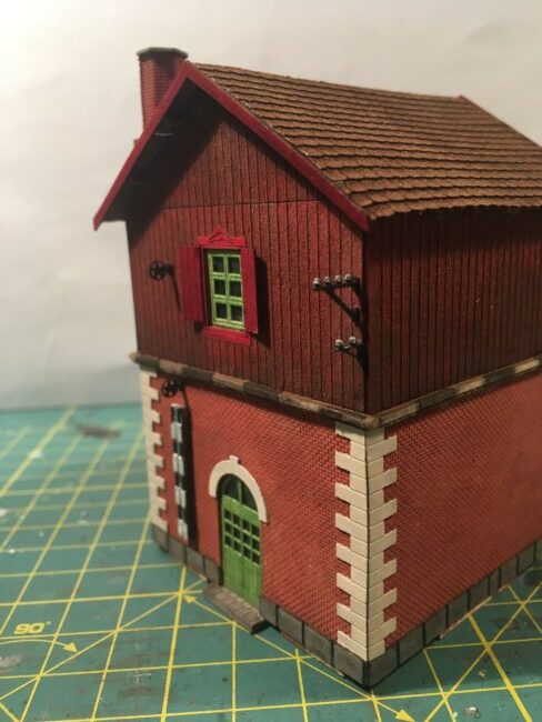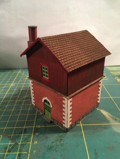 Bílé rohy z velkých kvádrů jsem nechal bez barvy. Původní barva kartonu naprosto odpovídala. Dveře, okna i komín byly natřeny štětcem ještě před vyříznutím a zasklením. Úplně samostatně jsem stavěl komín, který byl co do kompletace nejobtížnější kvůli svému šestihrannému profilu.