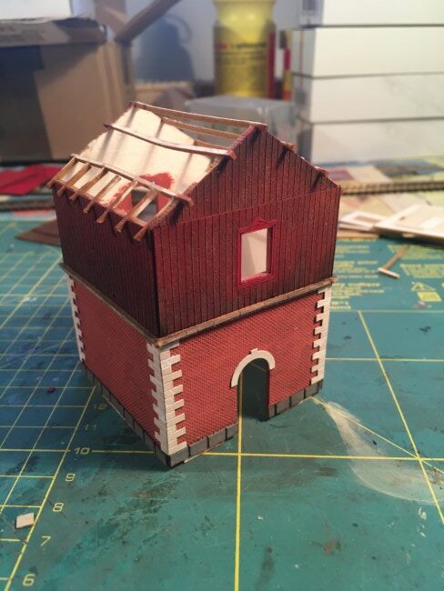 Zejména pak u trámů krovu, kdy mezery mezi díly na listu vypadají podobně jako díly. Na to jsem přišel až po nalepení, kdy domnělé trámy byly užší než výřezy ve šítech. Stejně tak pro mě nebylo patrné jak se mají udělat krokve. Nařezal jsem proto na správnou délku proužky kartonu až po nalepení. Správný postup to spíše nebyl, ale fungovalo to. Aspoň si člověk trochu více zamodelařil.