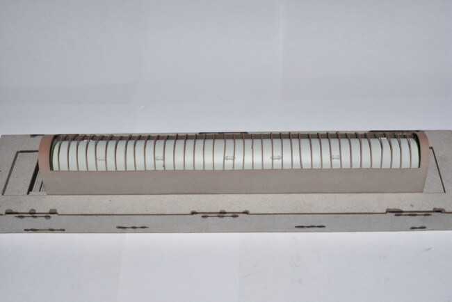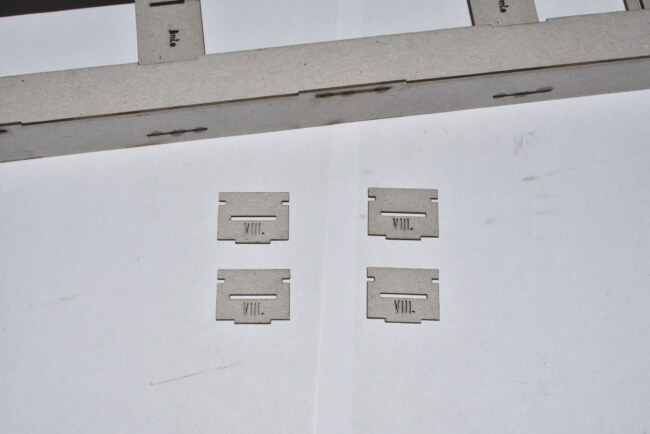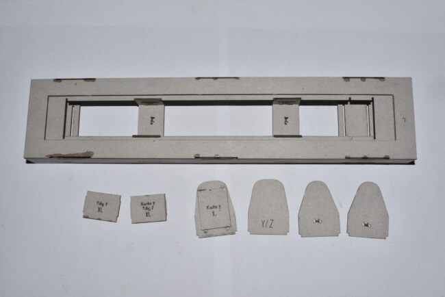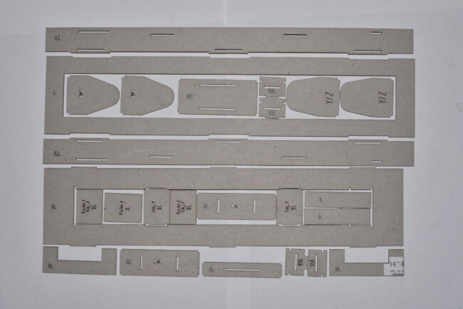 Je to jeden milimetr silný karton, řezaný na laseru. Díly jsou číslované římskými čísly. Nicméně nenechte se splést, nejdou popořadě. Číslování je zde čistě rozlišovacího charakteru 😀 Po vyřezání všech dílů by to mělo vypadat takto: