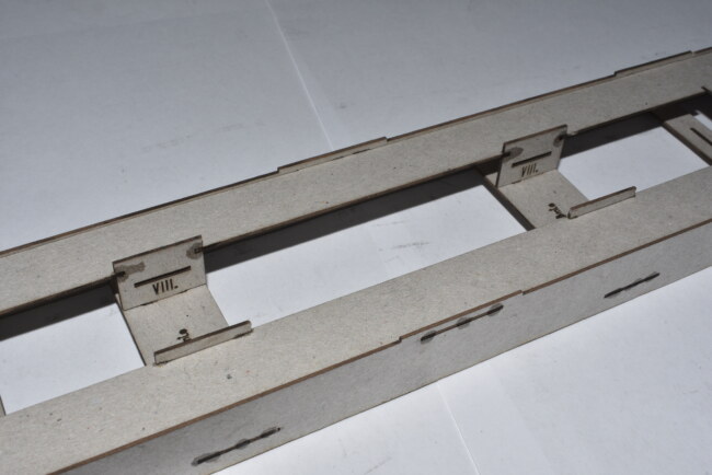 Vlepte spodky do dílů IX. a vršky do dílu III. tak, jak je na fotce. Tyto dílky dělají výškový distanc podlah, na které se budou pokládat vozy, takže si zkontrolujte, že jste je zasunuli až na doraz. Jde to dobře, není třeba používat sílu a něco deformovat, jen je potřeba si to pohlídat.