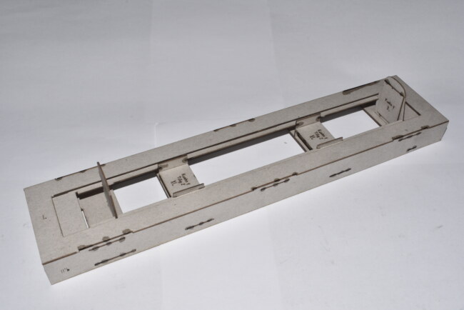 Čelní příčky „Bmto“ zasuneme do krajních poloh. NELEPÍME!!! Příčky zapadnou do osazení v dílech VI./VII. a tím máme určenou rozteč vozu. „Podlahy“ jsou v základu dělané pro Bmto, neboť jsou to nejvyšší vozy, takže tam nic nevkládáme. Vložíme vůz. Tento je důležité vkládat bez pojezdu, bez oken, ale s návalkami (černé přechodové gumy).