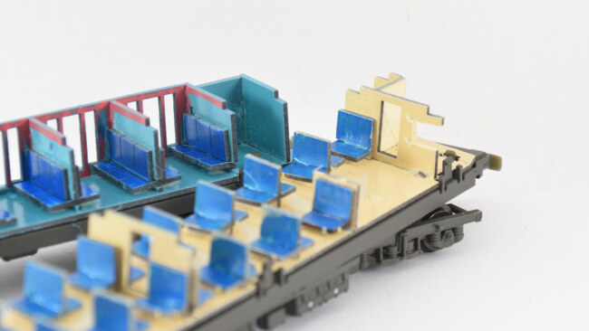 U interiéru Beer je zachovaná původní barva obložení stěn tyrkysová + červené lišty. Jen sedačky jsou přečalouněné modře. U Bdt262 byly u některých vozů sedačky ponechané v kožence, někde byly přečalouněné modře. Já zvolil modrou.
