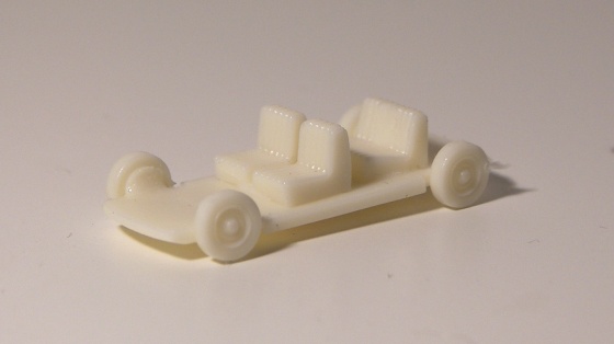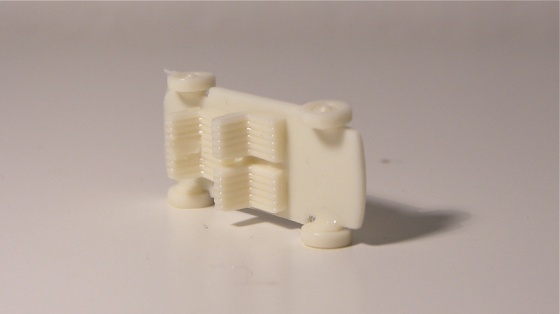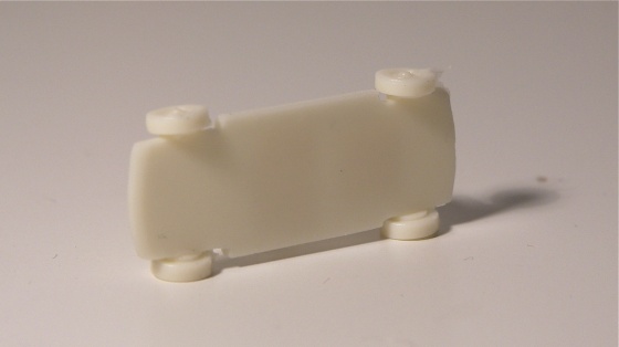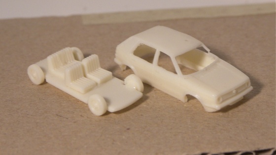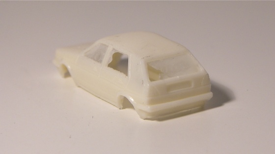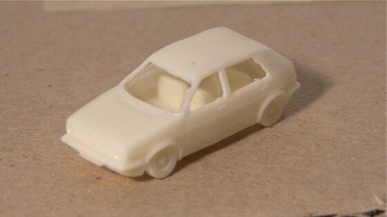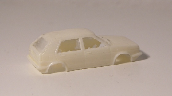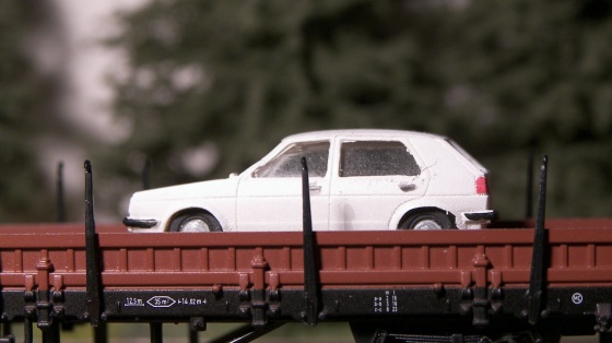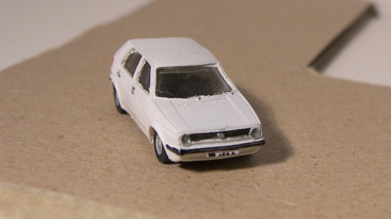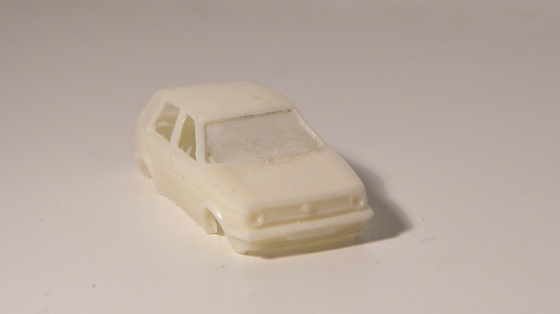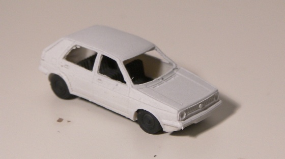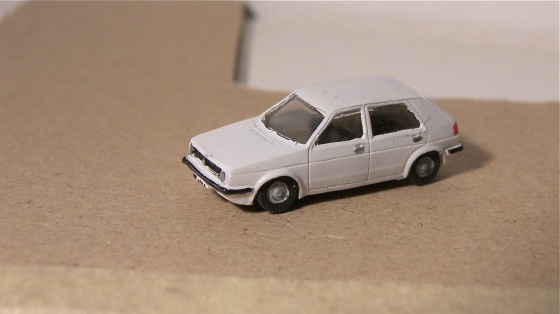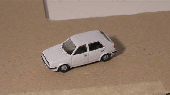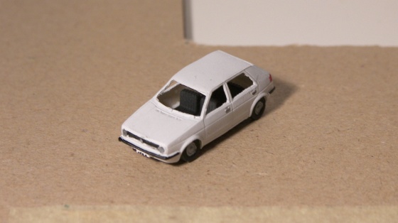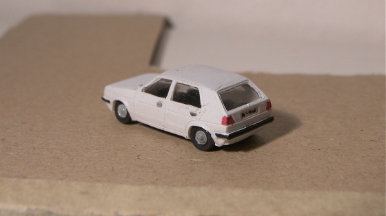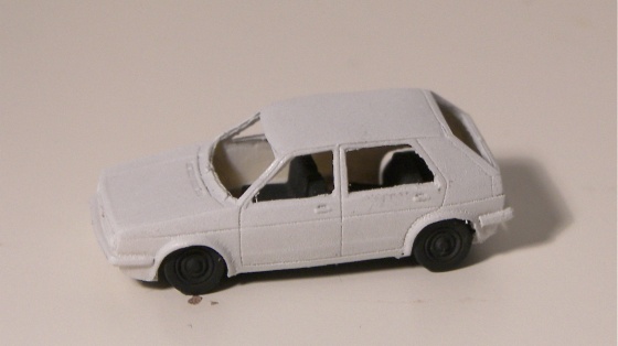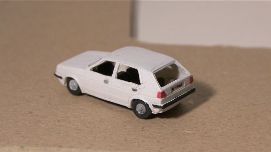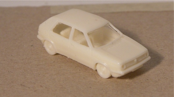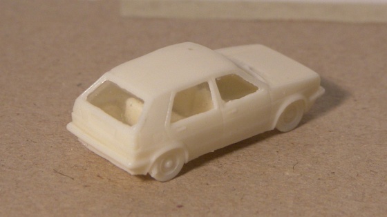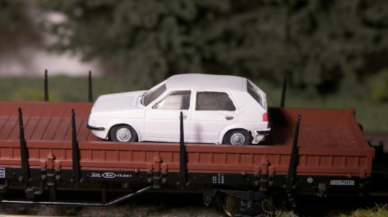 Máte-li nedostatek osobních automobilů, nebo vám jezdí po kolejišti prázdné „autovozy“, určitě potěší další univerzálka do epochy IV a V – pětidvéřový Golf 2. generace jako stavebnička z polyuretanu. Nazývat to stavebničkou, natož stavebnicí, je asi trochu přehnané, jsou to tři díly, které do sebe z neznámých příčin zapadají a tím je auto hotové.