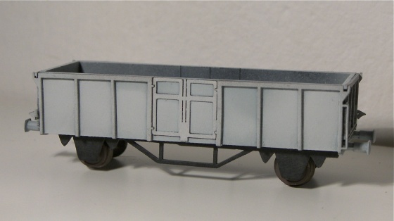 Vůz zatím nemá osazené drobnější detaily. Vůz jsem stříknul Surfacerem jednak pro sjednocení, ale také jsem četl, že při stříkání to kolegům hodně saje barvu, dokud se karton „nenapustí“ – to by mělo být přestřikem Surfacerem odstraněno a povrch se pak bude chovat jako u čehokoliv jiného.
