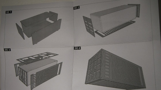Součástí stavebnice je i jeden kratší kontejner. Dá se koupit i zvlášť a je to ideální doplněk právě na tento vůz. Základ tvoří opět plastová krychle, na kterou se lepí kartonové doplňky.