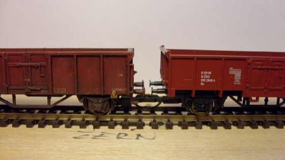 TTmili: tak jsem na to koukal a našel jsem potíž – tyhle Es by měly mít dvojkolí 7.7 mm, ale když je tam dám, tak mi sedí vůz proti ostatním nízko, takže bohužel je to asi dělané na 8.0 mm (no ono to zas tak poznat nebude). Na 7.7 je horní hrana nákladového prostoru shodná s Es od Tilliga (neřeším zvýšené čelo). Dveře jsou větší než Tillig, ale dle fotek jsou správné a naopak Tillig je má menší. Dveře jsou asi o půl milimetru širší. Celý vůz je taky asi o půl milimetru širší než Tillig. Ale když dám za sebe Tillig a MŽ tak to nevypadá jako pěst na oko.