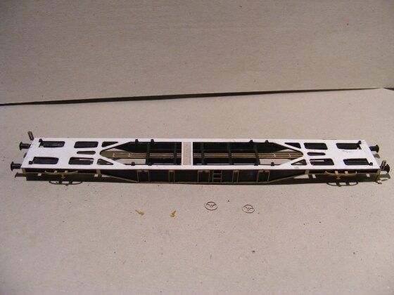 mezera mezi originál podvozkem a rámem je přibližně stejná jako s tim podvozkem od čembalíka.Ten výřez v čelníku je přesně pro kinematiku od Peha(vejde se jen verze s magnetem).U sestavování podvozků se mi osvědčilo pro ložiska udělat díru skrz ten plast.Pak na to lepit papírovej vršek a pak do těch děr ložiska,vyjde to akorát.Co se váhy týká první vagon jsem udělal podle návodu,a je to snesitelný tak se zatíženym kontajnerem.Další verzi jsem zkusil zatížit a dal jsem olověnou zátěž do výřezů v bočnicích a nad podvozky.Ty jsem zatmelil a neni ani poznat že tam nějaká zatěž je.