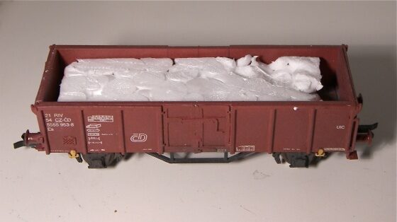 Snažil jsem se vymyslet nějakou rychloverzi, abych nad výrobou nákladu netrávil víc času, než nad samotným vozem. Čerpal jsem inspiraci od Jirky Sládky a jeho článku o tvorbě nákladů a taky od Houmra (určitě poznáte, o který nápad šlo). Primárně jsem si určil, že náklad by měl pasovat do vozu Es. Naštěstí jsou na tom všechny tyhle krátké „uhláky“ rozměrově podobně (MŽ Es 11, Tilig Es 31, Vtr), takže stačí vyrobit jeden náklad pro všechny. A protože uhlí má každý, snažil jsem se zopakovat náklad dřevěných klád, který jsem realizoval už na voze Eas Čechofracht.
