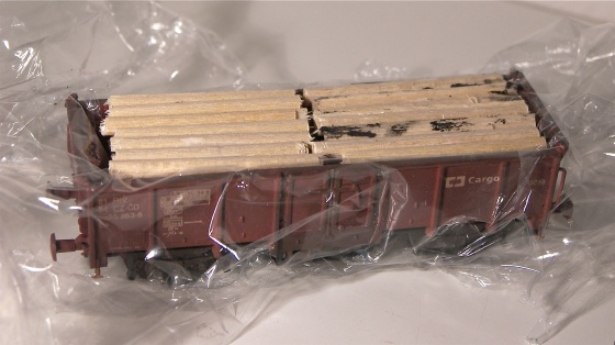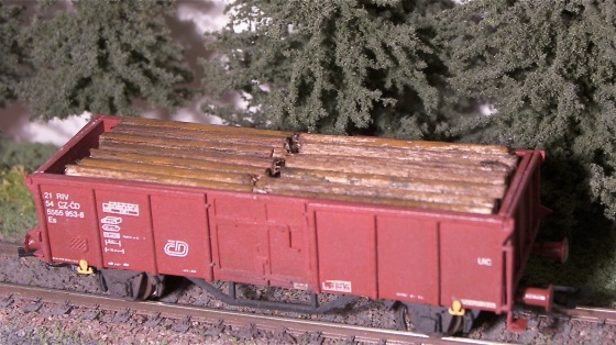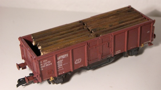 Soudruzi z NDR kdysi lepili náklad do uhláků na dřevěné špalíky. mělo to vyšší hmotnost a lehčí vůz líp „seděl“. Sám jsem si dělal náklad krátké kulatiny složitějc. Nařezal jsem z větví množství špalíků o něco kratších, než šířka vozu. Z rozštípnutých „nepodarků“ jsem udělal svislé vypodložení na koncích a doprostřed vozu – na dva bloky dřeva. A pak jsem usilovně lepil. Takový náklad je pak použitelný nejen ve voze, ale i odstavený někde na okraji lesa či nedlážděného nákladiště – výsledný efekt odpovídá dříví srovnanému do „metrů“.
