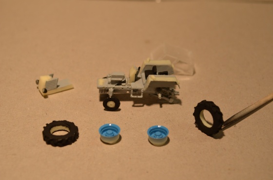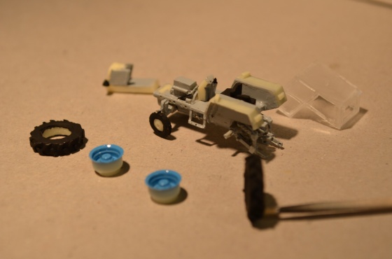 Přední nápravu jsem osadil blatníky, přilepil jsem do interiéru volant a nakonec natřenou kabinu a potom přední kapotu na motor. (opačně to jaksi nejde).