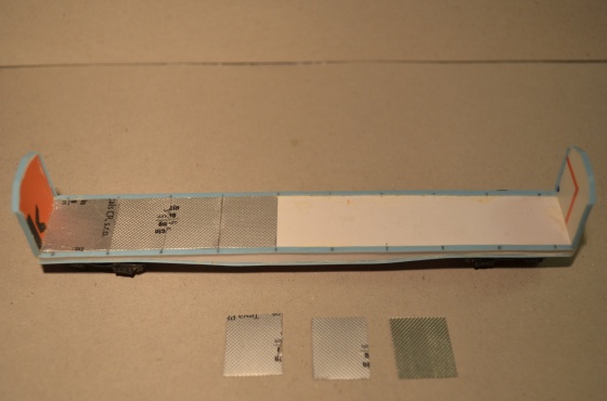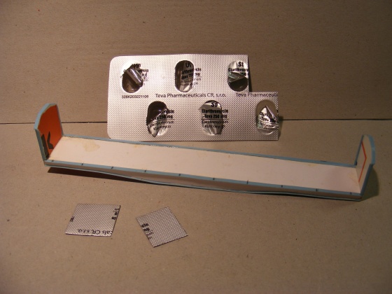 Podlahu jsem pro zvýšení modelovosti (na skutečném voze je opatřena krablovaným plechem) polepil kousky vroubkovaných destiček z obalů léků.