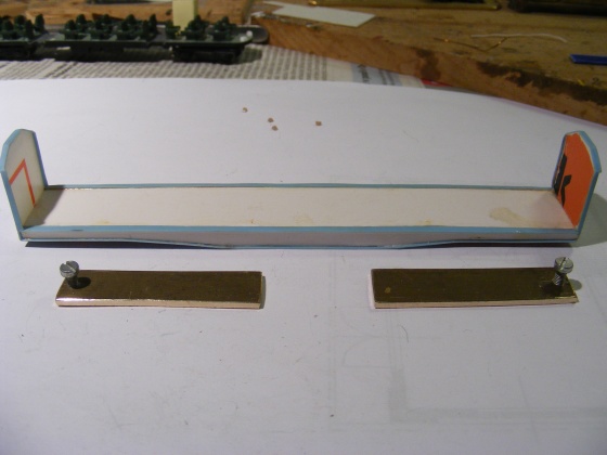 Dále jsem z mosazného plechu tl. 2 mm vyrobil dva obdélníky, které jednak slouží jako závaží, potom jako držák podvozků, ale také jako zajištění proti průhybu podlahy vozu.