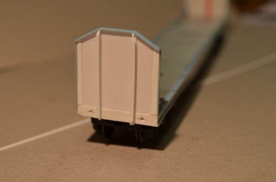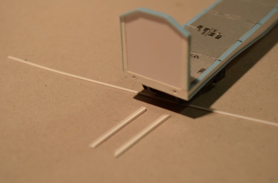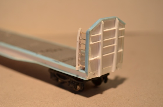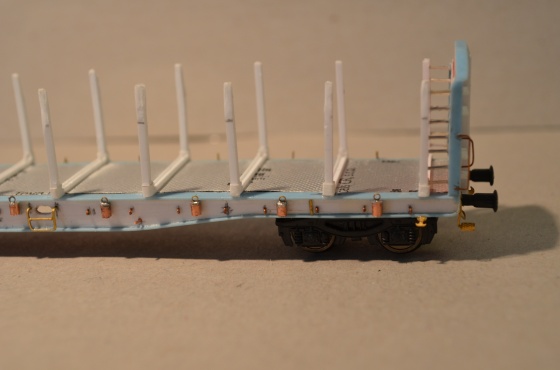 Vždy první klanice z každé strany vozu je navíc s čelem spojena žebříkem. Původně jsem chtěl tyto žebříky použít z nabídky Dk-modelu, ale rozměrově vůbec neodpovídaly, takže jsem je nakonec vyrobil z drátku.