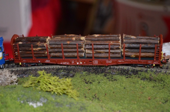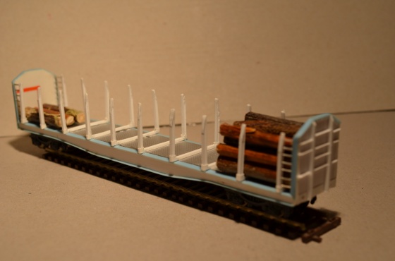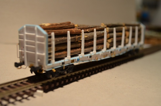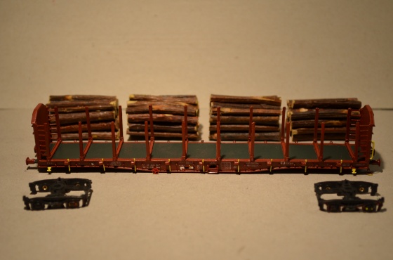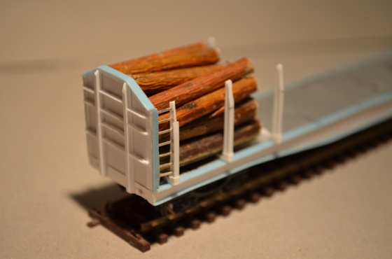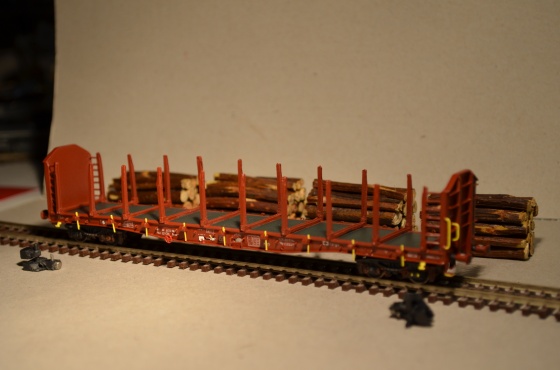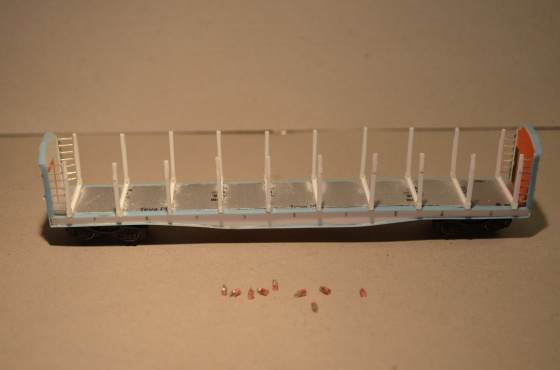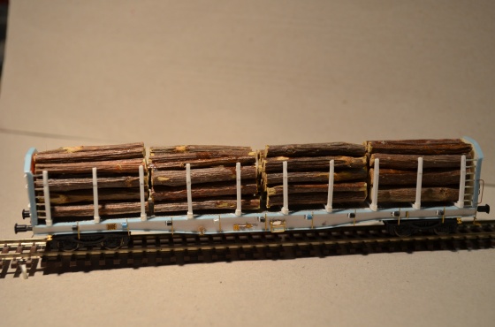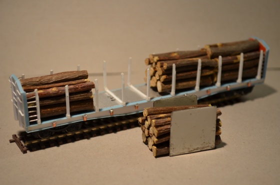 Dále jsem si z plechu vyrobil jednoduchý přípravek na výrobu nákladu, nařezané kousky větviček délky 35 mm jsem do něho ukládal a zalepoval Herkulesem. Tím mi vznikl náklad surového dřeva podle skutečné předlohy.