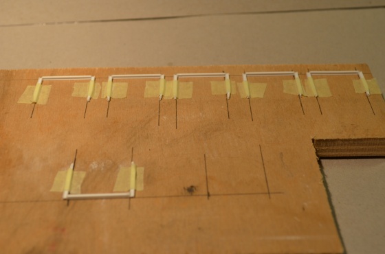 Na kousek překližky jsem si namaloval rozměry vzdáleností klanic od sebe. Klanice zafixoval lepící páskou a postupně vlepoval příčníky.