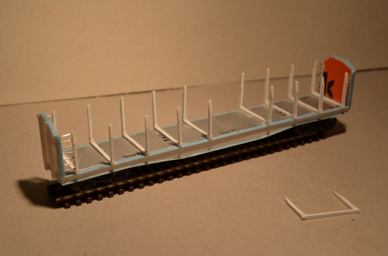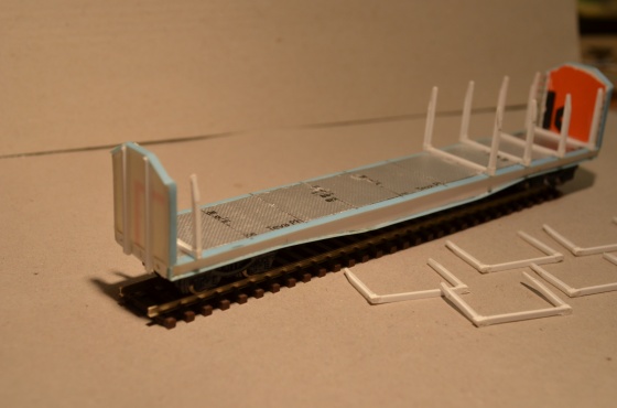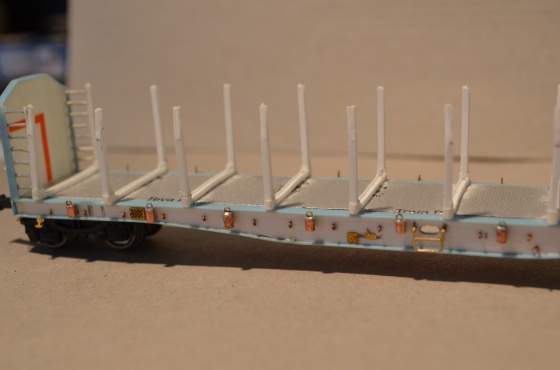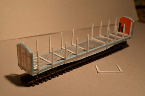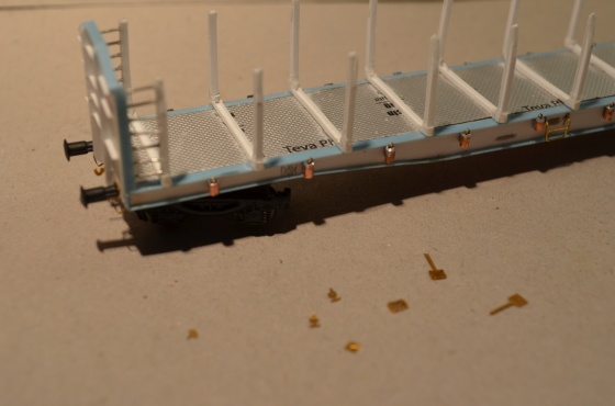 Dál jsem vyrobil na protilehlou bočnici vozu napínáky. K tomu jsem využil opět kousky profilu U 1,5 jako držáky a napínací kladky jsem znázornil pomocí válečků z nálitků stavebnic LPH (zábradlí).