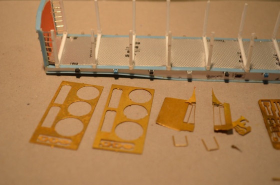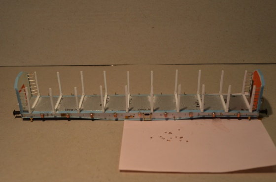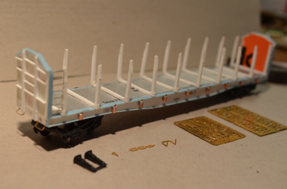 Pro snadnější sestavení žebříků jsem si první páry klanic nejprve přilepil k vozu, potom jsem vsazoval jednotlivé stupně.