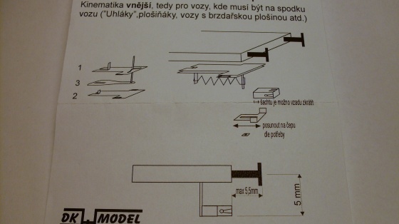 V tom to případě se bude jednat o stavbu páru kinematik vnějšího typu. ta se umisťuje většinou zespodu na rám vozů jako jsou uhláky, plošiňáky… DK model nabízí i variantu vnitřní, kterou můžete uplatnit do „Zetek“ a podobně. Pro tu je ale potřeba v podlaze vozu vytvořit otvor pro pohyb trnu.