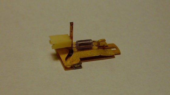 Když se zdá že to funguje, natáhněte mezi trn a držáček pružinku. I při maximálním vychýlení by se měl trn volně vrátit do středové polohy. Tak. Teď si to celé zopákněte a složte i druhou kinematiku. Trn z té první uštípněte zhruba v půlce a využijte ho na stavbu kolegyně. Já si zatím dám pauzičku.
