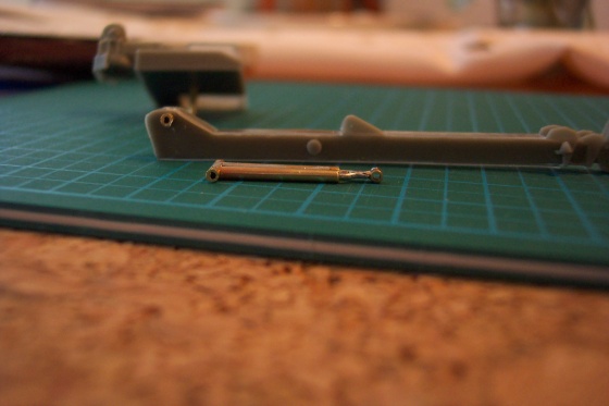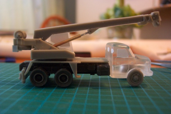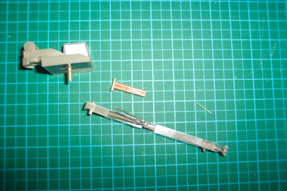 Hlavná úprava stavebnice začala ramenom žeriavu, hydraulika musela pracovať a veža sa musela otáčať. Hydraulické valce som nahradil mosadznými trubkami, zletoval spolu a u spodu som dal daľšiu trubku naprieč. Odrezal som čapy ramena a rovnako nahradil mosadznou trubkou. Do otočnej veže išla trubka zo spodu.