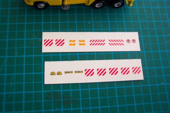 V stavebnici sú len štyri popisky, čo je dosť málo v porovnaní so skutočnosťou, takže nejaké som si vyrobil sám. Išlo hlavne o červeno-biele pruhy, štátnu poznávaciu značku, značku maximálnej dovolenej rýchlosti vozidla 60km/h a oranžovo-červené tabuľky. Ako ŠPZ sa vynikjúco hodila TT 20-11 :-).