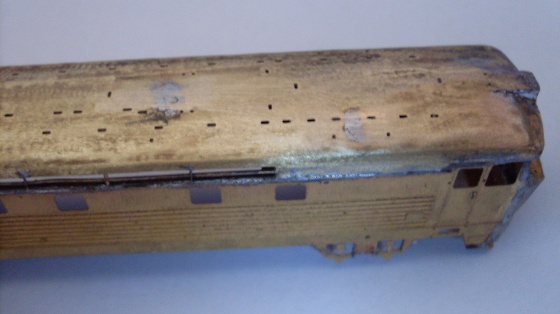 Teď přicházejí na řadu další úpravy stavebnice. Ta totiž odpovídá II. sérii ve výrobním stavu. Já ale dělám současný stav a tak jsem musel pár věcí na střeše předělat. První věc, která je jinak, je výfuk. Ten se totiž dočkal dosazení tlumiče, takže původní díru ve střeše jsem zapájel. Stejně tak to chce ucpat díru po parním generátoru. U toho pozor, některé současné mašiny bez generátoru díru mají pořád, další jí mají zadělanou jako teď já, aby byla souvisle se střechou a další mají díru překyrtou kouskem plechu, takže je nad ní vystouplý obdélníček.