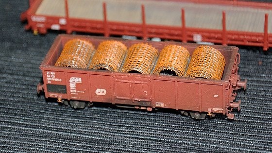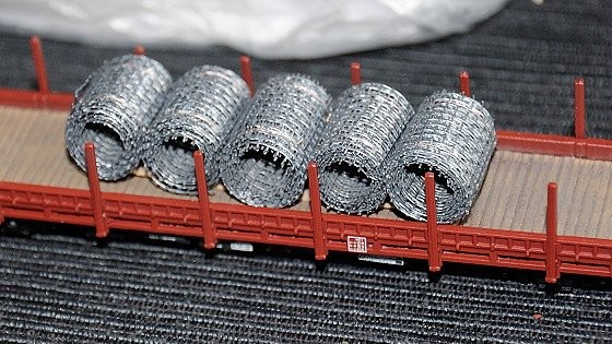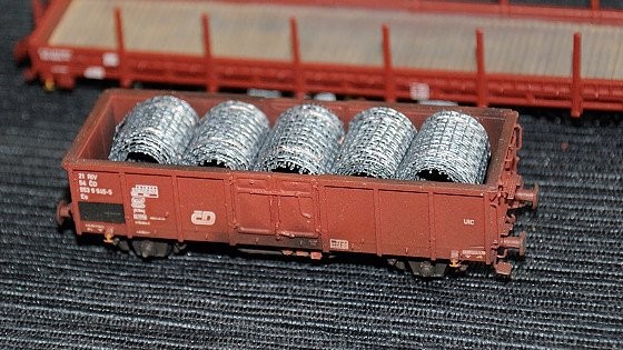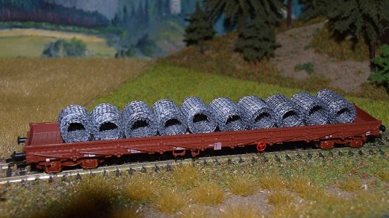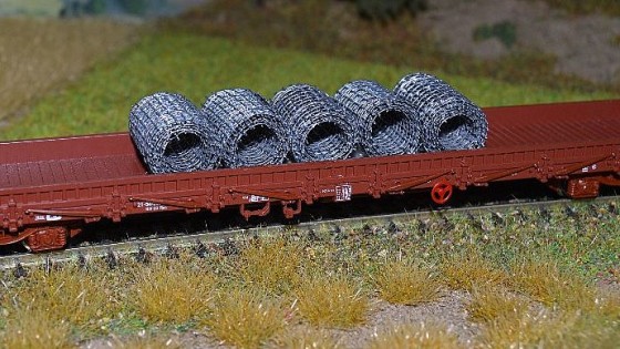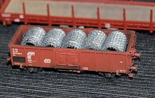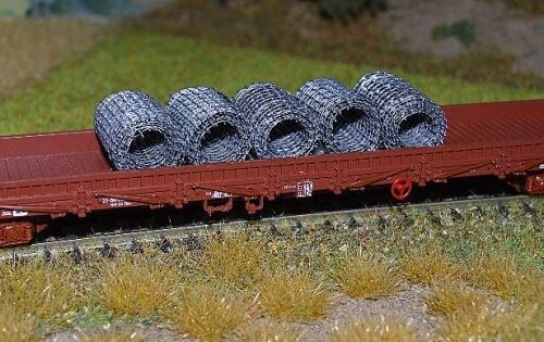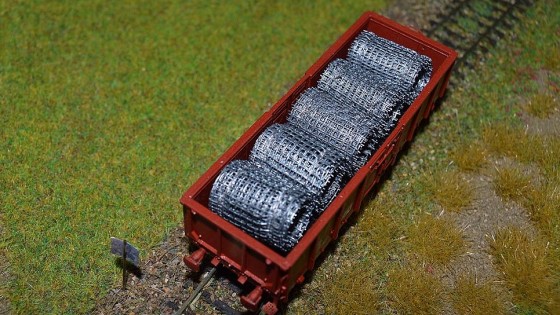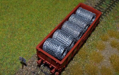 Náklad armovací síťě – balení 1 x 5 svitků, spojené k sobě. Rozměr balení 65 x 19 x 14 mm. Pasuje do vozů Eas, Es, Res TT atd. Možné použít i pro H0 (bude představovat menší verzi nákladu). Na výběr více variant. Náklad je lehký, nelze použít jako závaží na vůz.