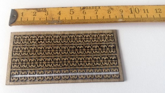 Leptaná stavebnice 8 ks závaží pro napínání trolejového drátu – leptané a kartonové díly. Dále obsahuje 4 ks držáků kladek na stožár a několik profilů pro pevné uchycení drátů do stožáru.