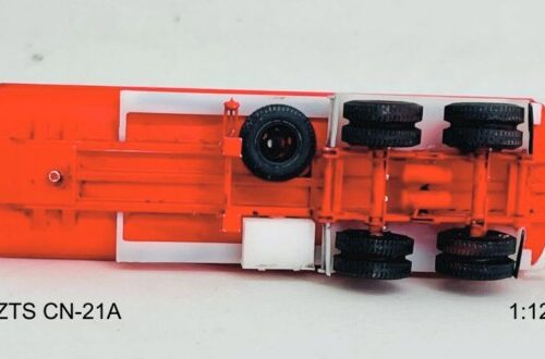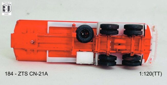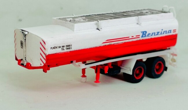 3D tiskem vyrobená stavebnice dvounápravového návěsu pro přepravu kapalin ZTS CN-21A s určením na pohonné hmoty. Obsahuje tisknuté díly a obtisk s motivy Benzina.