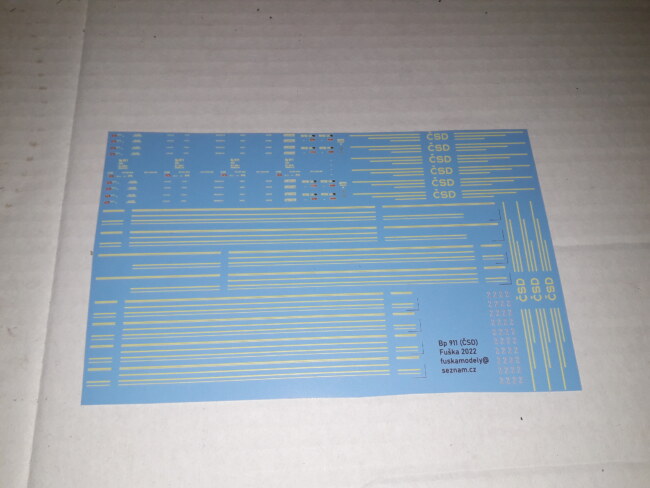 Velká obtisková sada pro čtyřvozovou patrovou jednotku ČSD Bp911 žluté, období 60.-70. léta s žlutými fousy. Obsahuje kompletní popisy, všechny „fousy“, nápisy ČSD a další pro čtyřvozovou jednotku Tillig / Arnold.