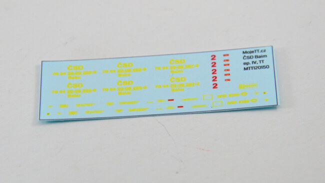 Z obtisku je možné obtisknout 1 vůz, epocha IV, 3 různá čísla na výběr. Obsahuje 2 ks obtisku mřížky na střechu vozu. Obtisky jsou poskládané tak, aby šly odstřihovat vždy v pravém úhlu a aby byly všechny z nich postupně dobře přístupné.