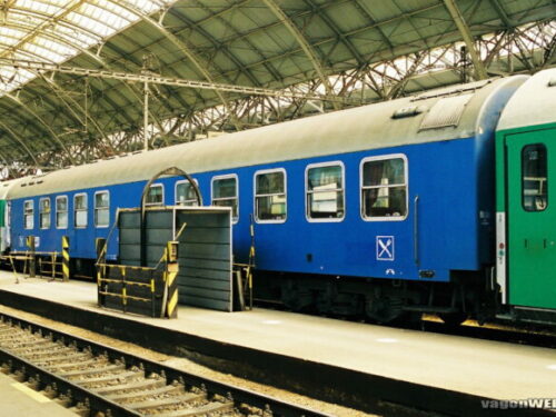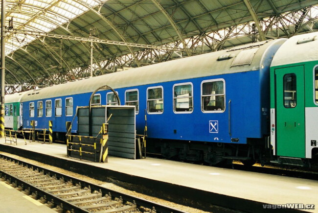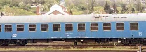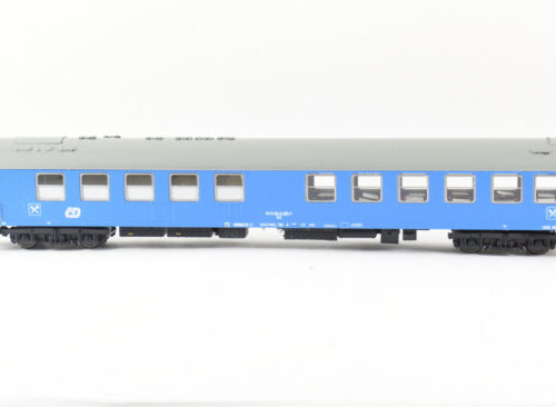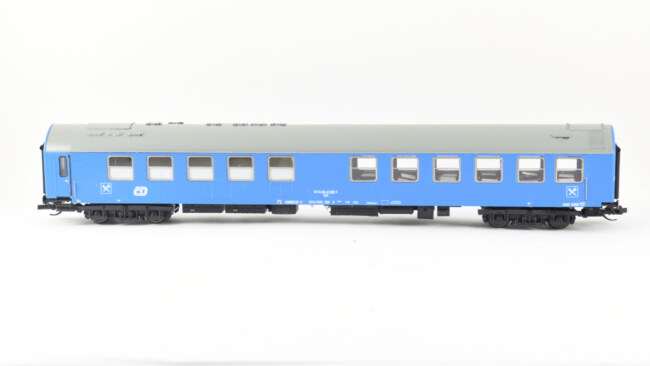 Obtisk jídelního vozu ČSD/ČD WR (období cca 1990 – 1995 po zavedení bílých popisů), v provedení modrého vozu, bílé nápisy, popisy ČSD i ČD vč. nového loga ČD (od 1993). Vozy mají skříň typu Y.