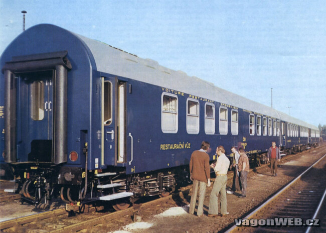 Obtisk jídelního vozu ČSD WR (období od výroby do roku 1990), žluté popisy. Obsahuje i původní provedení s nápisy „RESTAURAČNÍ VŮZ“ a nadokenními nápisy, ale také pozdější piktogramy (po přechodu z nadokenních nápisů). Vozy mají skříň typu Y.