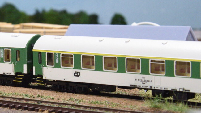 TT/1:120, obtisk 100 mm žlutých pruhů na označení první vozové třídy pro osobní vozy.